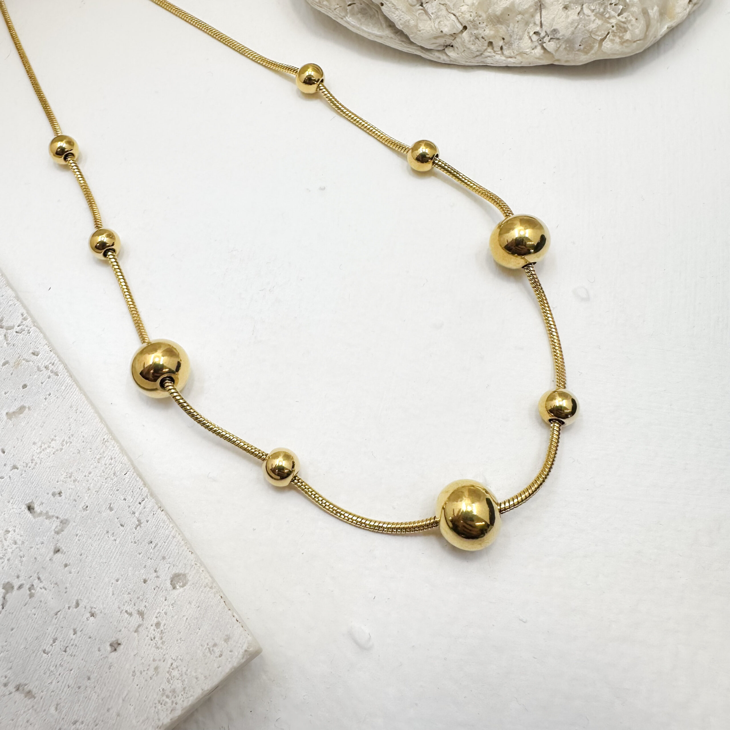 Kis gömbökkel tarkított, közepes hosszúságú, állítható nyaklánc.