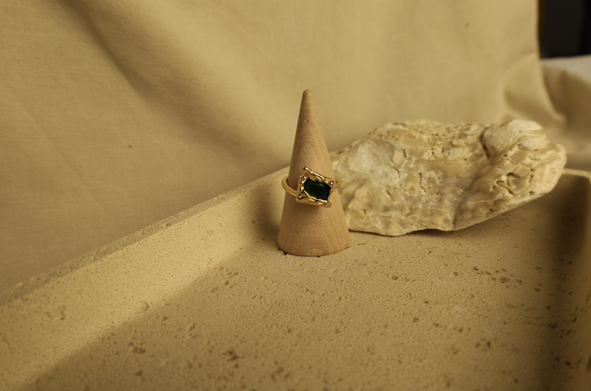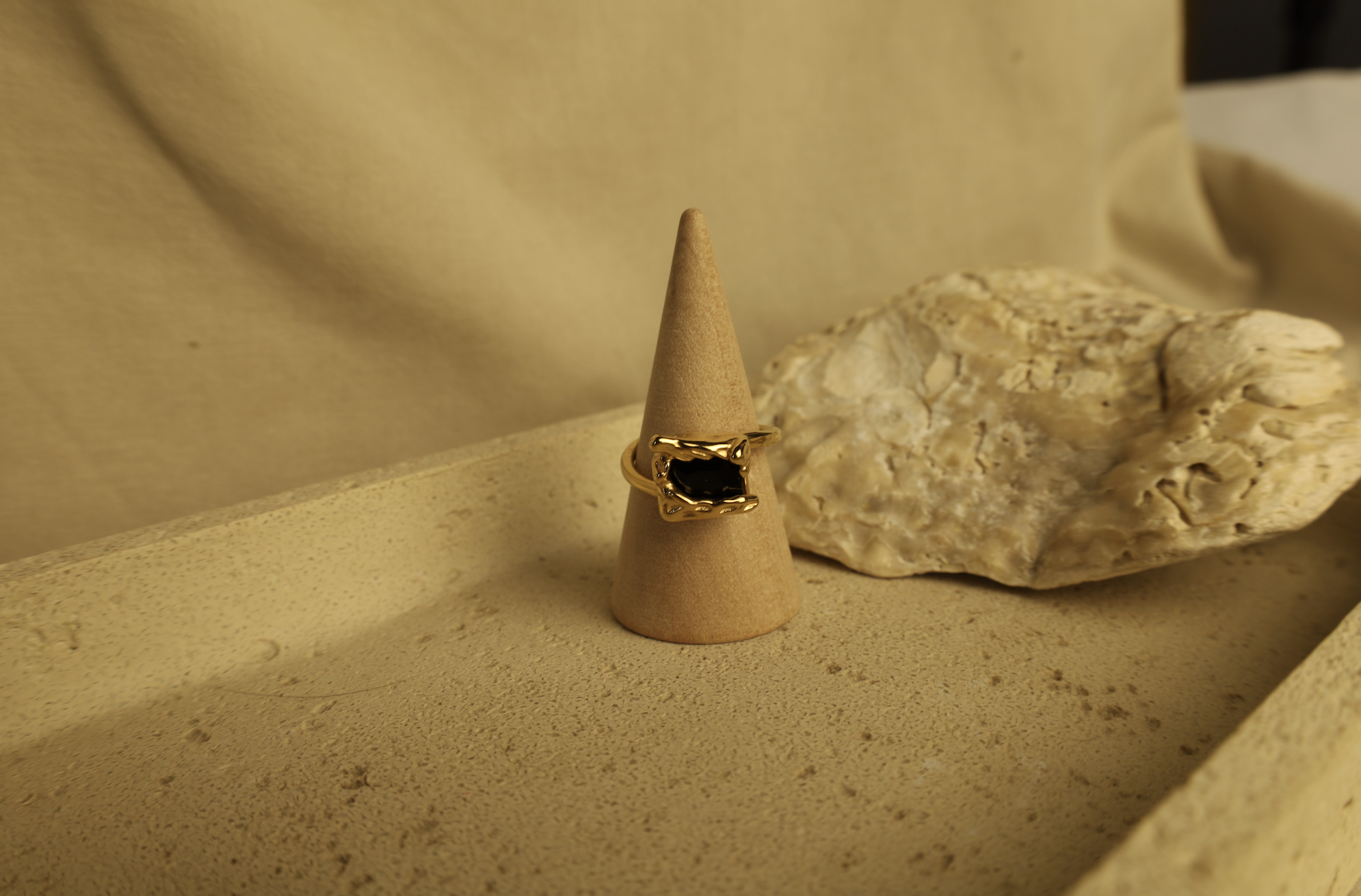 Fekete köves gyűrű, melyet egyedi formával rögzítettek a foglalatba, vonzó és titokzatos! Állítható, így biztosan jó lesz az ujjadra.